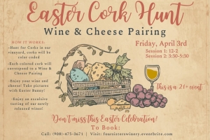Each cork is color coded to match a wine and cheese pairing! Bring your friends and family for a great time filled with laughs and surprises. Take photos with the Easter Bunny.