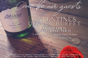 Enjoy a romantic evening in the Barn Parlor - a Valentine's Buffet Dinner prepared with the wines of Little Ridge Vineyards. Doors open at 5pm and dinner starts at 6pm