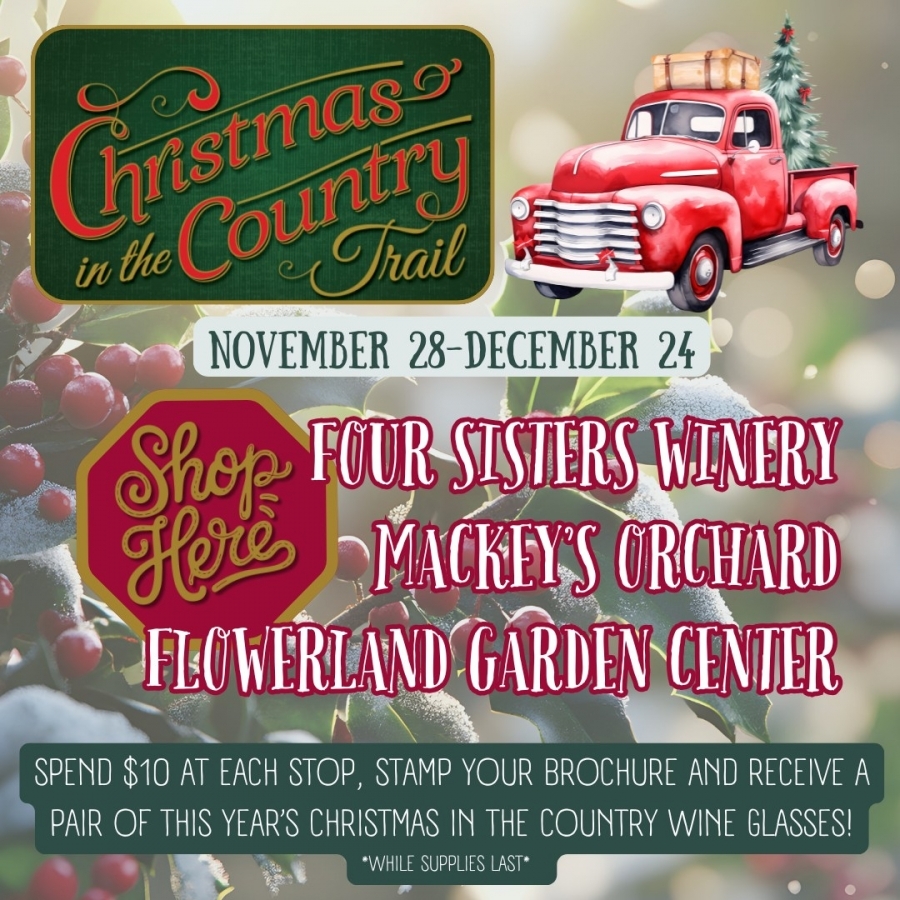 Mackey’s Orchard, Flowerland Growers and Four Sisters Winery invite your family to enjoy a fun-filled day of Christmas trees, baked goods, wine tasting and much more along the Christmas in the Country Trail! You will receive a pair of commemorative trail wine glasses with a $10 minimum purchase an stamp from each farm. Please note Flowerland is closed Sundays and Four Sisters is closed Wednesdays. Mackey's is open daily.