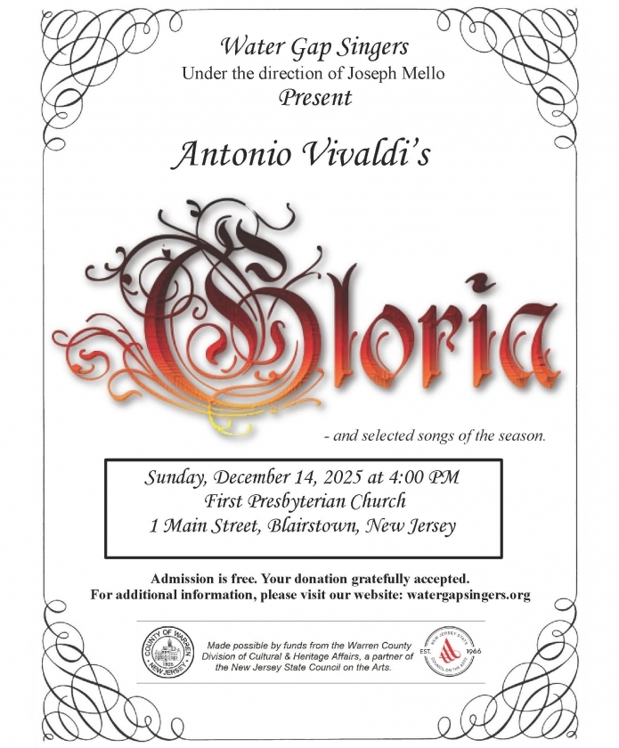 Swing into the holiday season with the Water Gap Singers, who will perform a variety of seasonal music - including Vivaldi's Gloria - under the direction of Joseph Mello. Free - with goodwill offerings gratefully accepted - and a reception after the performance.