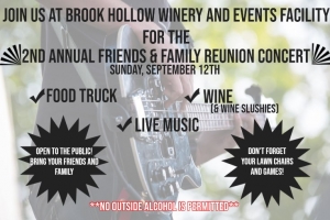 Bring food or leave it at home with an onsite food truck. Enjoy our wine and live music with friends and family. Don't forget to bring lawn chairs and games!!