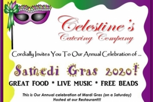 Celebrate Mardi Gras a few days early with Samedi Gras at Celestine's! Lots of food (Jambalaya, Crawfish fresh from New Orleans, Fried Chicken, Cornbread, Collards and more), live music, dancing, and beads for all to enjoy!