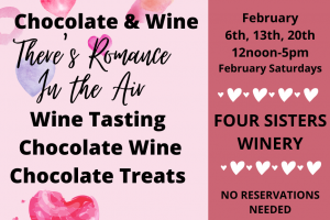 February is the month of Romance and Four Sisters Winery will recognize each Saturday of February as “Cupid’s Day”. Bring someone special with you and enjoy a wine tasting of up to 9 wines featuring a pairing of chocolate with three of the wines. February 6, 13 and 20 from 12pm- 5pm and the cost is $10 per person.