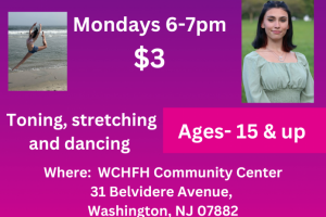 Bring water and wear comfortable clothes to class aimed at stretching, toning and dancing. This is a class for those 15 and up.