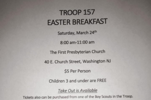 Support Boy Scout Troop 157 at the First Presbyterian Church by having breakfast with the Easter Bunny! They will have eggs, pancakes and sausage. Takeout is available as well. While you are there, get your picture taken with the Easter bunny. Tickets are available at the door for $5 and kids 3 and under are free.