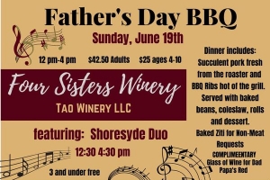 Roasted pork and ribs are the focus of this day at the winery celebrating all dads. Dinner includes succulent pork fresh from the roaster and bbq ribs hot off the grill, baked beans, coleslaw, rolls and dessert. Baked ziti will be available for the non-meat meal.