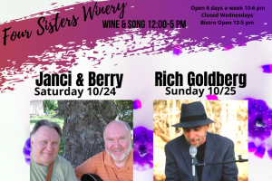Enjoy weekend Music on the Deck while tasting Four Sisters wines and the full Vineyard View Bistro menu while taking in the picturesque scenery. Live music Saturday: Yanci and Berry; Sunday: Rich Goldberg.