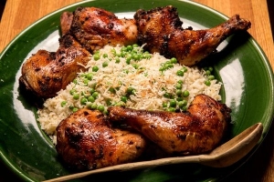 Half roasted chicken with Spanish rice and peas. $15 Meal Deal (over 21 years old) includes a glass of wine. $8 Meal Deal (under 21 years old - no wine).