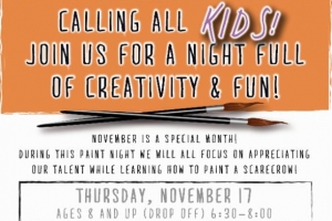 Kids Paint Night! Drop children ages 8 and above or accompany your child 7 and under. $20 per child includes canvas and paint, canvas, instruction and snack.