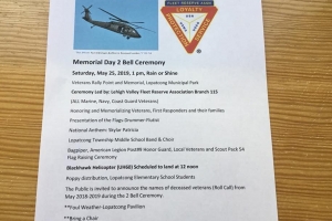 Memorial Day 2 Bell Ceremony will be held at Veterans Rally Point and Memorial, Lopatcong Municipal Park. Public is invited to attend the honoring and memorializing of Veterans, First Responders and their families. More details are in the attached photo.