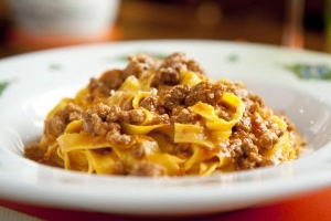 flat, wavy-edged pasta, shrimp, zucchini, garlic, fresh herbs