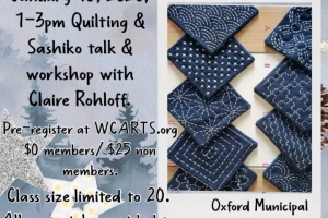The Oxford Municipal building is hosting a quilting and Sashiko talk with a Sashiko workshop to follow with Claire Rohloff. Materials provided. Class is limited to 20. $25 for non-members.