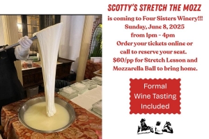 Join Scott for a fun-filled afternoon of mozzarella-making and wine tasting! You'll learn the art of crafting fresh mozzarella balls to take home, all while enjoying a wine tasting featuring Four Sisters' finest selections.