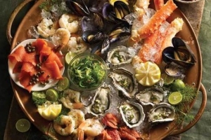 Menu: Raw & Steamed Seafood Bar; shrimp, oysters, clams, and crab claws served with cut lemons, cocktail sauce, fresh horseradish, hot sauce, mignonette sauce, and horseradish dijon sauce. (All food sold separately.)