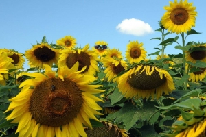 Donaldson Farms is pleased to offer fun and picturesque tours of approximately 25 acres of Black-Oil Sunflowers that are planted throughout our farm during the late summer and early fall! The Black Oil seeds of the sunflower have very thin shells, easy for virtually all seed-eating birds to crack open, and the kernels within have a high fat content, extremely valuable for birds, especially as food during migration and winter. They also attract more of a variety of bird species than use of other seeds. Come enjoy the bloom of acres and acres of sunflowers in and around our farm!