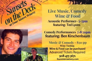 This week's Sunset on the Deck features a live acoustic performance followed by a comedy show! Ted Lyons performs 5-7pm within the folk/folk rock/60's/country rock genres, then Ben Kirschenbaum will take the stage. He is a New York stand-up comedian and writer that has a unique way of talking to the audience as if it were a speech but the end result is always laughter. Tickets are required ($30 includes entertainment only; food, wine & beverages available for purchase). Please call 908 475-3671 in advance to secure your reservation with payment.