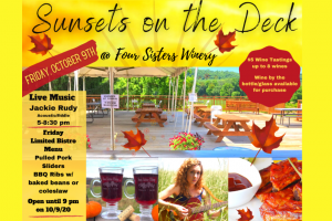 Friday, October 9, 2020 - 5:00pm to 8:30pm Start your weekend with wine and song - and BBQ! - on the deck at Four Sisters Winery. This week's music is by Jackie Rudy. Website