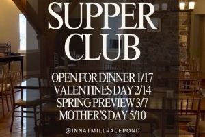 Milrace Pond is featuring a supper club at their fabulous inn. Menu features appetizers, main dishes, dessert and drinks.