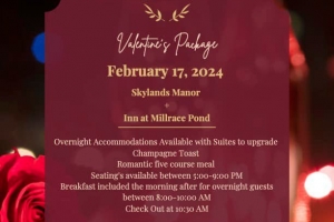 Celebrate Valentine’s Day with at the Inn at Millrace Pond or Skylands Manor. Choose either a romantic dinner with your loved one or the Overnight Package which includes dinner, an overnight stay, and breakfast the next morning in one of the Inn's fantastic rooms.