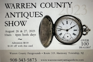 A two-day show held mid-August at the Warren County Fairgrounds in Harmony Township, featuring 150 dealers offering a wide variety of antiques including primitive items, Victorian and other rare pieces, furniture, jewelry, pottery, toys and even a blacksmith and a ceramics restoration expert.