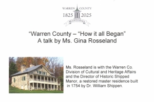 Gina Rosseland of Warren County Land Preservation's Division of Cultural and Heritage Affairs will be giving a talk on the beginnings of Warren County, appropriate for the County's Bicentennial year. This is free and open to the public. Light refreshments will be served.