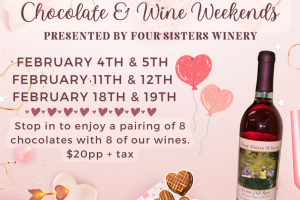 For a romantic atmosphere, soft music, chocolate, wine and valentine’s decor, looking no further than Four Sisters Wine and Chocolate event. Treat your special someone with a decadent array of chocolate and a tasting of up to 8 wines. The winery will feature a special valentine's pairing with chocolate and 8 delicious wines.