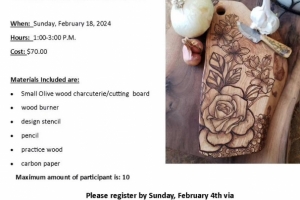 Learn the art of wood burning, also known as pyrography, with Robin of EnShrine Design. During this class, each participant will create a wooden board with choice of two stencils.