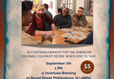 What happens when a loyalist, a patriot, and a pacifist walk into a bar? Calling all history-curious brewery enthusiasts to join RevolutionNJ in the tradition of debating revolutionary ideas in bars with friends. Hosted by Invertase Brewing Company on September 7 from 1-3pm, reenactors will lead participants in exploratory discussions, questioning the ideals that surrounded the American Revolution.