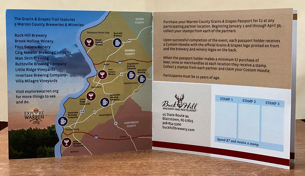 A: You can ask the participating breweries and wineries, or contact the Explore Warren County Tourism Partnership at tourism@co.warren.nj.us or toll free at 800-554-8540.