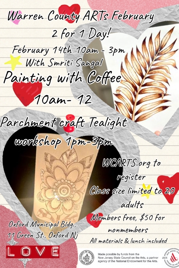 WC ARTS presents a 2 for 1 arts day with Painting with Coffee from 10am - 12pm and Parchment Craft Tealight from 1– 3pm. All materials and lunch included. Space is limited.
