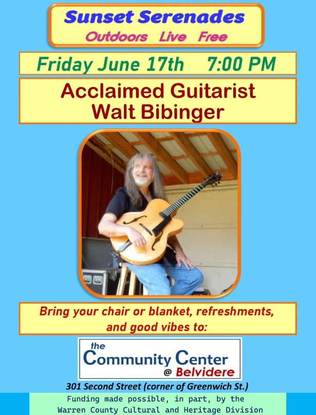 The Community Center @ Belvidere launches a new monthly music series; the inaugural performance is acclaimed guitarist Walt Bibinger. Bring a chair or blanket, refreshments, and good vibes!