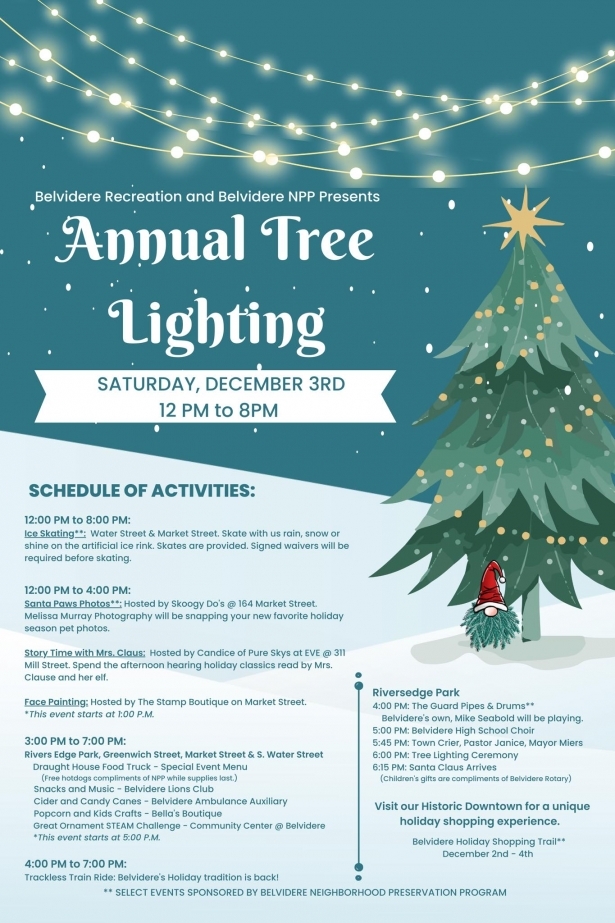 Belvidere is hosting their annual Christmas tree lighting complete with Santa, ice skating, Santa Paws photos, music, snacks, crafts and more!