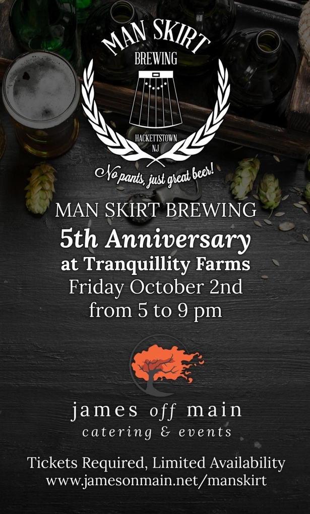 Celebrating Man Skirt Brewing's 5 year anniversary at Tranquillity Farms, the event will feature farm activities, live music, beer by Man Skirt Brewing, and food by James off Main. Advance purchase of tickets required - not offered at the door.